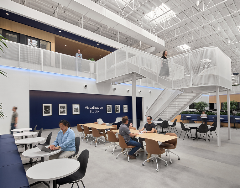 Brand elements and textures are also subtly integrated into the design, making the space uniquely Ford. Most notably, electric blue LED accent lighting unifies and energizes various team areas and highlights architectural features while nodding to Ford’s commitment to electric vehicle innovation.